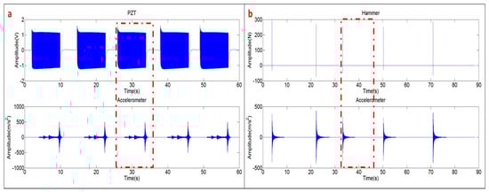 Time signals: (a) chirp excitation (PZT) and response; and (b) hammer excitation and response.