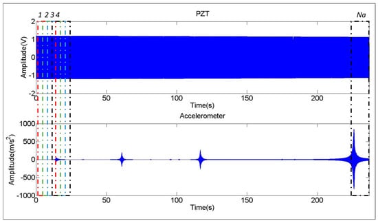 V(t) is the signal generated with the signal generator (unit volts). A is the amplitude of the signal (for the NI9263 the maximum A is 10 V), which is kept constant for all the excited frequencies (Equation (7)). is a parameter that controls the frequency variation of the signal (higher means a faster variation in the signal frequency). Adjusting and selecting the appropriate , the frequency band excited can be controlled [].
