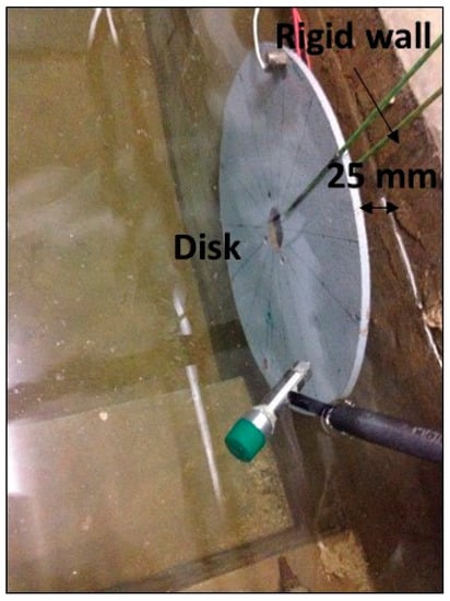 The effect of the surrounding fluid is even more important for the case that the tested structure is close to rigid walls as reported also in many studies [,,,,,]. Therefore, it is desired to see possible changes of the FRF due to the induced motion on the structure due to a Hammer impact in this situation. For this reason, the disk has been excited with the two aforementioned methods, when it is submerged in water and with a nearby rigid wall (Figure 5).