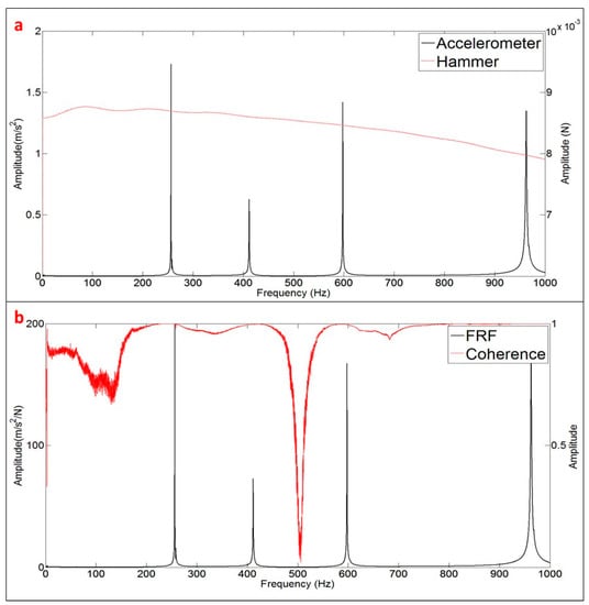 The FRF is calculated according to Equation (8). Figure 6a shows the signals of the Accelerometer and Hammer in the frequency domain, after applying the FFT. Both signals are analyzed until 1 kHz, including the first four modes of the tested structure (see peaks of the Accelerometer signal (. The response of the Hammer ( shows that the structure has been properly excited, with the same order of excitation force in all the frequency bandwidth. Figure 6a shows just one average triggered by the Hammer (one impact as seen in Figure 3b).