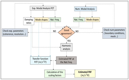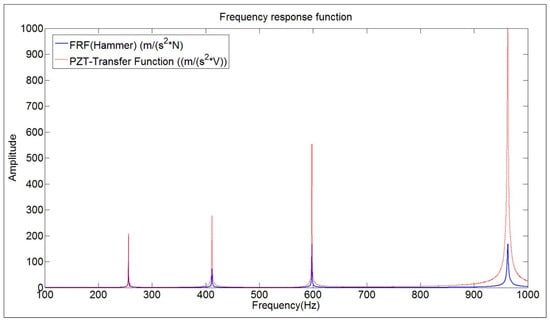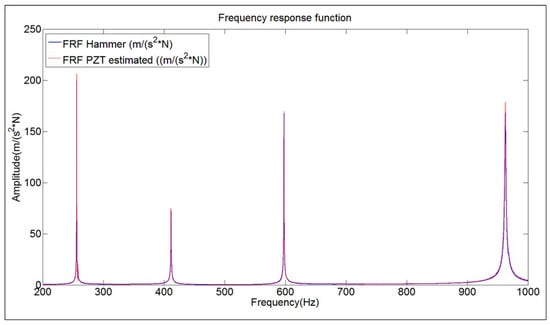 This methodology is applied to estimate the amplitude of the FRF at the natural frequencies of all the analyzed modes below 1 kHz. The scaling factors to correct the transfer function obtained with the PZTs (Figure 7) are obtained comparing the amplitudes of that function with the amplitudes of the estimated FRF for each mode. This means the transfer function ( PZT-Transfer Function in Figure 7) is reescaled to have the same amplitude at the natural frequencies than the estimated FRF obtained with the proposed method. Therefore, for each mode there is a scaling factor that corrects the FRF in the vicinity of the corresponding mode according to Equation (3).
