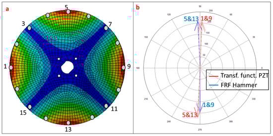 In the past, PZTs have been used as exciters proving that natural frequencies and mode shapes can be properly determined. Particularly, plenty of studies can be found where PZTs have been used for structures vibrating in air [,,,,,,]. Wang [] and Yan [] used PZTs for active control vibration in order to reduce the flutter in a thin disk. Yang [] and El Sekouri [] determined in their respective studies the natural frequencies and mode shapes of thin plates vibrating in by using PZTs. Cheng [] used several patches to excite a thin structure and estimated the added mass effect of those ones. These studies are mainly concerned with very thin disks such as storage disks. More recently, Presas [] used several patches to excite a relative stiff and rotating disk with several excitation patterns that really occur in rotating turbomachinery. Nevertheless, in that study, only the natural frequencies and mode shapes of the structure are evaluated, but the damping ratios and scaling factors of the vibration modes were not determined. Finally, Gomis-Bellmunt [] mentioned the main advantages and drawbacks of using PZTs as exciters and particularly the hysteresis of PZTs is evaluated in that study. Although during the last decade extensive work has been performed using PZTs as exciters for active/passive vibration of several kinds of structures, accurate determination of the FRF of those structures with these exciters has not been discussed yet.