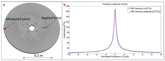 (a) Simulation model including the position of the force and the measurement point; and (b) application of the harmonic response compared to experimental result for the 3rd mode.