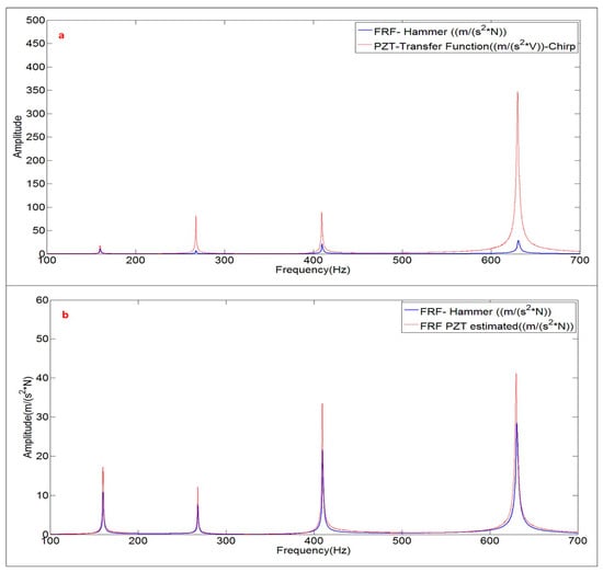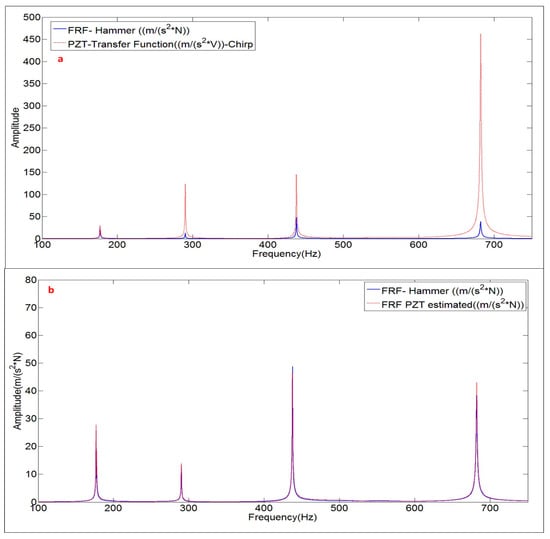 (a) Comparison PZT transfer function with FRF; and (b) comparison FRF estimated with the PZT and FRF obtained with the Hammer. The Structure is close to a rigid wall.