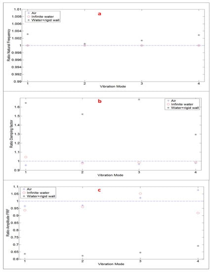 Finally, in order to summarize the comparisons between estimated FRF (with the proposed method by using PZTs) and FRF obtained with the Hammer (Figure 13, Figure 15 and Figure 17), the modal parameters that define the FRF (natural frequencies, damping ratios and amplitudes) are compared (Figure 18). The ratio is shown for all the analyzed modes. For all the analyzed modes, the natural frequencies estimated with both methods are practically the same for all the tested situations. For the damping ratios and amplitudes, for the Air and Infinite Water case the difference is less than ±5% and ±8%, respectively. Nevertheless, for the nearby rigid wall case, as commented and justified in this Section, there is an overestimation of the damping ratios for the Hammer method and as a consequence an underestimation in the amplitudes of the FRF function.