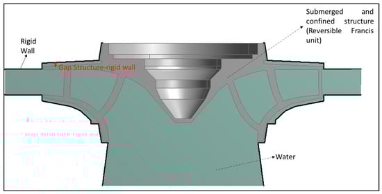 One example of the potential interest of this application is the case of some types of hydraulic turbines, such as Francis units, which are totally submerged and confined with very short distances to external walls (Figure 19). For such structures that are subjected to dynamic loads it is crucial to accurately determine the real FRF and therefore to obtain a realistic structural model with its real operating boundary conditions. This could avoid catastrophic failures and fatigue damages that have been reported for such structures [,]. As discussed in the previous section, the use of a classical excitation method such as an impact Hammer may lead to an underestimation in the amplitude of the resonance and to an overestimation of the damping ratios. Therefore, this can have a negative effect for fatigue calculations, if the structure is being excited close to one of its natural frequencies during its operating conditions, since the useful life will be overestimated.