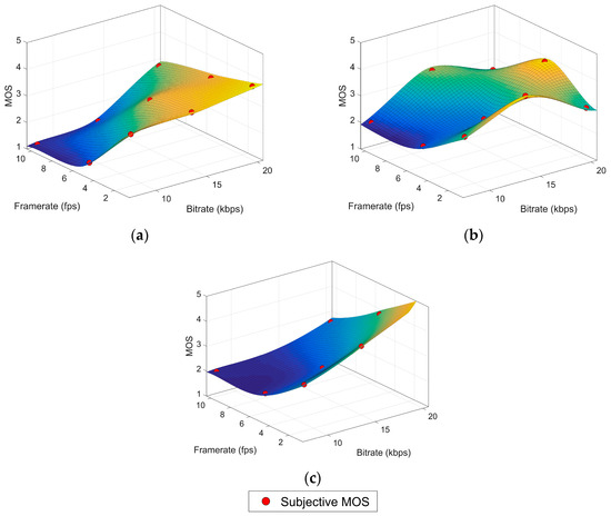 In the previous section we have shown that the ITU reference model does not seem suitable for the experimental data. As an approximation to an appropriate model, we have used the thin plate spline interpolation method [32] to find a surface for each of the content variation subsets. The thin plate spline is defined as the unique minimizer of the energy function defined in (7) for the two dimensional case. This method provides a perfect fit (R2 = 1) for the given control points. The minimization constraint produces a smooth surface (minimally “bended”) which matches the assumption of no great variations in quality values between the studied input variables values. The surface can be defined as in (8), a weighted sum of the radial basis function in (9) where x(i) are the control points, K is the number of points and ai, wi are the optimization parameters. In this case, the control points are the samples from our subjective dataset, considering the bitrate as our first dimension or feature (x1) and the framerate as the second feature (x2). The resulting MOS for a given sample is y(i). This interpolation technique produces a representative surface but not the practical model we aim for, since the complexity of the resulting equation makes it difficult to interpret the coefficients. Figure 1 shows three surface plots of thin plate splines fitting the subjective dataset. Figure 1a is obtained from points in the high variation content (HVC) block as control points, while points in the low variation content (LVC) and reduced low variation content (rLVC) blocks are for Figure 1b,c, respectively. The shapes of the HVC and rLVC surfaces are very similar. Even the LVC surface could be regarded as reasonably similar, except for the bending forced by the anomalies already mentioned in Section 3. Our model proposal in the Section 5.2 is motivated by the resemblance between this geometrical profile and a sigmoid function.