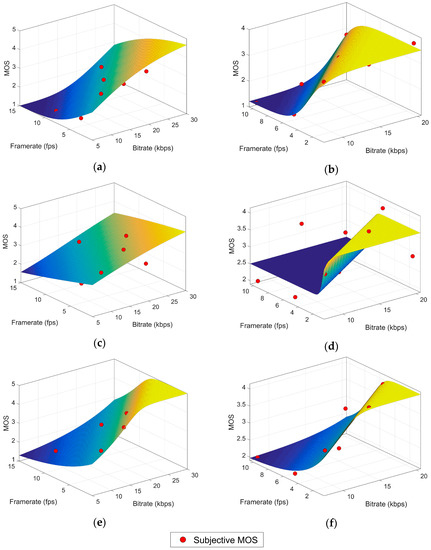 According to the available information in our experimental data, the G.1070 model can be simplified as shown in Equations (3)–(6), where MOS is the quality prediction in the usual 1–5 MOS scale, Ofr is the optimal frame rate for a given bitrate, IOfr is the maximum video quality for a given bitrate and DFr is the degree of robustness due to the frame rate. This model does not take into account content variation and therefore SI, TI information must be discarded: