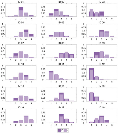 We have computed an R2 value for the MOSOLR estimator and the subjective MOS values in the dataset, resulting in a 90% of the variance explained by our estimator. This result is similar to the R2 obtained with the NR models. Pseudo-R2 values are also included in our results as Cox and Snell [37], Nagelkerke [38] and McFadden [39]. These pseudo-R2 values, as discussed in [40], cannot be interpreted like a classic R2 in a least squares regression since they do not provide a comparison between the predicted values and those in the dataset, but between the fitted model and the only-intercept model described above. However, they serve to compare different models.To provide a graphical approach to the goodness-of-fit, Figure 3 plots the category probability distribution Pi for every observation in our dataset as estimated by the OLR model against the proportions of scores computed from the subjective data πi. It can be observed how the model provides a very good fit for most cases, with an excellent performance for some of the observations (IDs 05 and 15) and only a small amount of higher errors (category 3 in IDs 01 and 03, and category 2 in ID 09). In particular, 71.1% of the πi estimations show a deviation smaller than 0.1.