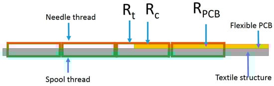 The interconnection technology between polyamide conductive thread and flexible PCB is realized by using a professional sewing machine (Mitsubishi LS2-190, Mitsubishi, Tokyo, Japan). The conductive thread is used as needle and as spool thread and results in low resistance. The distance between each stitch is 2.5 mm. The electric resistance model of interconnect is shown in Figure 1.