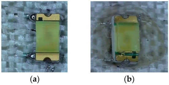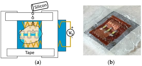 Two kinds of silicon were employed to encapsulation the whole textronic devices: Silicon 1 (Super XG-NO.777, CEMEDINE CO., LTD., Tokyo, Japan) and silicon 2 (Rubson Silicone, RUBSON, Boulogne-Billancourt, France). The process of encapsulation is shown in Figure 2. The painter’s tape was employed to make a mask around the LEDs. Then, the silicon was spread on the LED and wiped to make a smooth surface by a chemistry spatula. The samples are dried in an ambient temperature over one night.