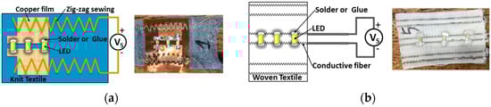 The LEDs were integrated on textile structures by two different types of connection, soldering with tin and gluing with silver adhesive (Conductive Silver Adhesive #051908-1R, POLYCHEM UV/EB INTERNATIONAL CORP., Taipei, Taiwan) and two types of silicone. Two kinds of conductive thread were employed in the textile structure. The silver-plated polyamide thread was sewn in a zig-zag pattern in order to link the flexible PCB with textile structures (Figure 3a) and the nickel-plated copper wire was woven inside the textile structure without flexible PCB (Figure 3b).