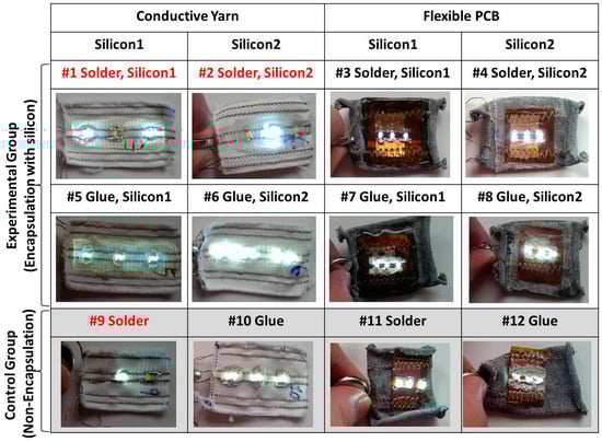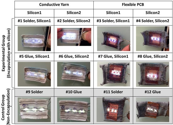 The final samples are shown in Figure 4. Eight different types of samples were realized with two different silicones, two different conductive thread integration methods, and two different LED integration methods. In addition, four types of samples without silicon encapsulation were made in order to conduct a comparative study for the washing tests.