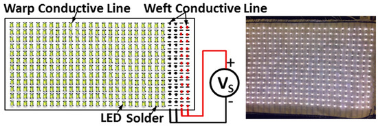 A large-scale sample with 16 × 23 LED array was investigated on a woven structure with silver-plated silver copper tinsel. The LEDs were connected with the warp conductive line and the power lines were connected with the four weft conductive lines. The tin solder paste (LOCTITE GC 10, Henkel Taiwan Ltd., Taipei, Taiwan) was used to glue the LEDs and warp conductive lines and the textile with LEDs array was heated under 230 °C for about 20 s for soldering (Figure 5). After the soldering, the silicon 1 was used to encapsulate the LEDs and the soldered dots (Figure 6).