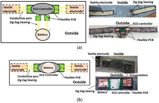 Textiles with ECG device encapsulated with Silicon 1 (Super XG-NO.777): (a) Remote battery; (b) Embedded battery.