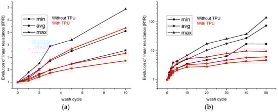 Evolution of electric resistance value of sewn conductive threads: (a) From 0 to 50 wash cycles; (b) From 0 to 10 wash cycles.