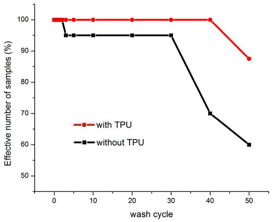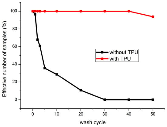 The effective numbers of samples are shown in Figure 9. After three washing cycles, resistance values of some samples without TPU cannot be measured. After 40 cycles, 30% of samples were failed. For the samples with TPU protection, all the samples are measurable till to 40 cycles and this result indicates that the samples are better protected by the TPU film.