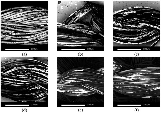 From the previous studies [], it is possible to notice that the conductive thread is not affected if the washing temperature is 30 °C. In order to understand the strong increase of the thread resistances, the samples were observed with a SEM. As shown in Figure 10a, peeling-off of plated silver areas can be observed even if the thread is not washed. This failure of coating derives from the mechanical movement during the sewing process. With the increase of the number of washing cycles, more and more plated silvers are destroyed by the mechanical movement (bending, friction, etc.) during the washing (Figure 10b–f). After 50 washing cycles, the silver material can rarely be observed on the outside surface of thread. This may explain the bad conductivity results of washed unprotected threads and the improvements obtained when TPU is used.