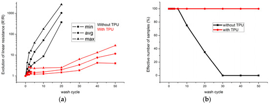 (a) Evolution of electric resistance value of sewn nickel-plated copper wire without and with TPU; (b) Evolution of the effective number of nickel-plated copper wire samples during washing tests.