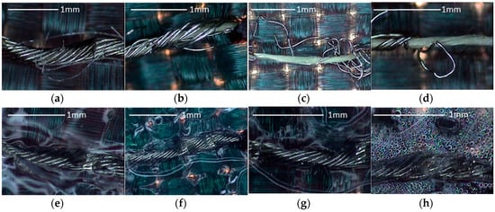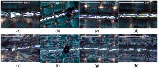 The images for the nickel-plated copper wire samples during wash testing are shown in Figure 12. For the samples without TPU, the number of broken nickel-plated copper lines increase with the washing cycles (Figure 12b–d). After 50 washing cycles, the silver material can be rarely observed on the outside surface of thread. The break of copper lines results from the mechanical movement during the test. This may explain the bad conductivity results of washed unprotected threads and the improvements obtained when the TPU is used. Meanwhile, for the samples with TPU protection, the nickel-plated copper lines are intact (Figure 12e–h). However, there was some water inside the TPU, showing that the connection of TPU and textile became loose.