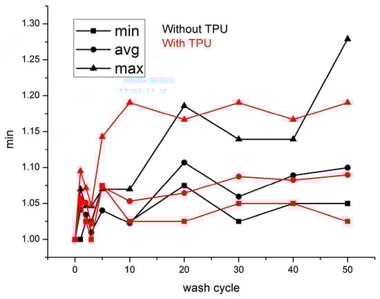 The absolute values of linear resistance are shown in Table 1. After 50 wash cycles, the average resistance value increases to more than 70 times to the initial value. The deviation of resistance value for samples without TPU is as high as 2773 Ω/m after 50 cycles of washing. As for the samples with TPU protection, the resistance value is in the acceptable range from 51 Ω/m to 307 Ω/m. The deviation is 109 Ω/m after 50 wash cycles. The lower initial resistance value for the sample with TPU can be explained by the increase of contact surface and contact pressure between filaments inside the thread under the pressure of TPU film.