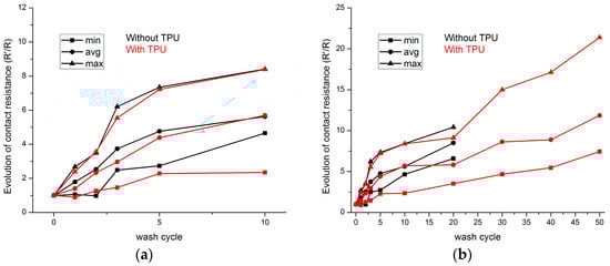 Figure 15 shows the evolution of contact resistance value throughout washing tests. The contact points and contact pressure between the conductive thread and PCB are reduced because of the mechanical stresses during the washing process. For the first 10 washing cycles, there is little difference between samples with and without TPU protection. Their contact resistance values linearly increase with the number of washing cycles (Figure 15a). The increase of contact resistance value of samples with TPU is lower than the samples without TPU. However, after 10 washing cycles, the samples without TPU are damaged. After 20 washing cycles, all the samples without TPU are destroyed and the contact resistance value cannot be measured (Figure 15b).