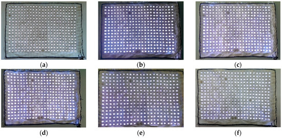 The samples of the textile with LEDs array: (a) 5 cycles of wash; (b) 10 cycles of wash; (c) 15 cycles of wash; (d) 20 cycles of wash; (e) 25 cycles of wash; and (f) 30 cycles of wash.