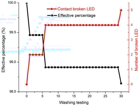 Figure 18 shows the lighting results after washing test and Figure 19 shows the number of broken LEDs. After 6 wash cycles, 4 broken LEDs were observed; and 5 broken LEDs were observed after 30 wash cycles. It might be because the sample was handmade and some of the LEDs were not soldered well, leading to an early breakage in the washing test. It was thought that the problem might be improved by using an automatic machine for manufacturing. Although there were still 5 broken LEDs found after 30 washing cycles, the encapsulation on the LEDs and LED dots were still in operation and the effective percentage of LEDs can achieve up to 98.6%. In the future, the automatic tin paste extrusion and LEDs placement on the textile should be investigated for mass manufacturing and better production quality.