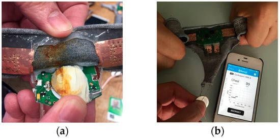 ECG wearable textronic devices are designed to realize smart clothing for monitoring issues. The ECG controller device is made on a rigid substrate. It is connected with the flexible and washable textiles based knitted electrodes, used as skin sensors, realized by TTRI (Taiwan Textile Research Institute) by silver-plated polyamide thread, zig-zag sewing, and flexible PCB. This device is able to monitor heart rate and ECG. It also contains an accelerometer in order to detect the movements. It is equipped with a Bluetooth communication module in order to send data to a smart watch, smart phone, or other communication devices. Two types of samples were designed: battery aside (Figure 7a) and battery embedded (Figure 7b). To achieve the effect of waterproof protection, both sides of the ECG controller and battery were also encapsulated by silicon 1.