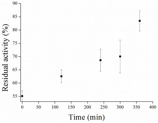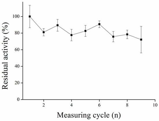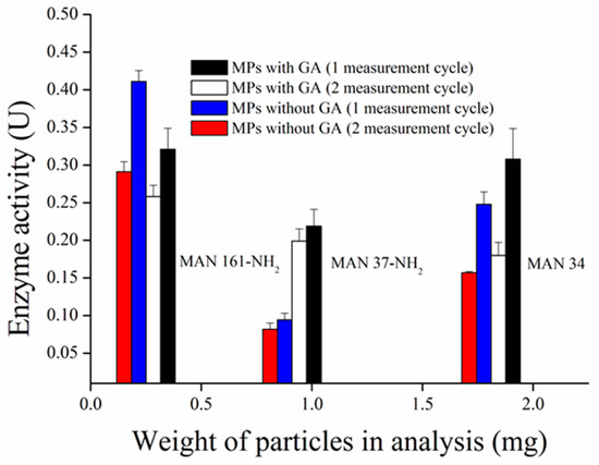 The idea of immobilization of enzymes onto MPs is in the possibility to use it repeatedly. The immobilization process via GA molecules was used before [20]. We discovered this process to be more efficient considering repeatability of measurements compared to our previous results, where immobilization to commercial MPs activated with carboxyl group and EDC reagent was used [4]. There were another immobilization protocols proposed earlier, however they require sophisticated procedures [19,47] (Figure 14). We claim that thus-modified MPs could create a good platform for automatic analyzers, microfluidics, or other uses where long stability of particles is required.