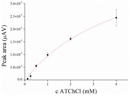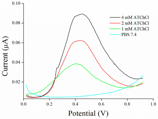 Saturation curve for AChE and ATChCl as a substrate was performed in concentration range from 0.125 to 4.0 mM with KM value calculated to 4.56 mM compare to native enzyme, where KM value was calculated to 99.57 µM (Figure 3 and Figure 4). KM value seems to be strongly affected by immobilization process as was also reported by Gabrovska et al. where KM value of immobilized AChE was approximately 3 mM compare to 0.9 mM of free AChE [31] or it could be influenced by external processes like irradiation as was described by Barteri et al. who calculated KM value to 1.37 mM [32]. A high value of KM was also provided by human mutant AChE [33,34]. Peaks forming at the potential 427 ± 22 mV were revealed during this assay.
