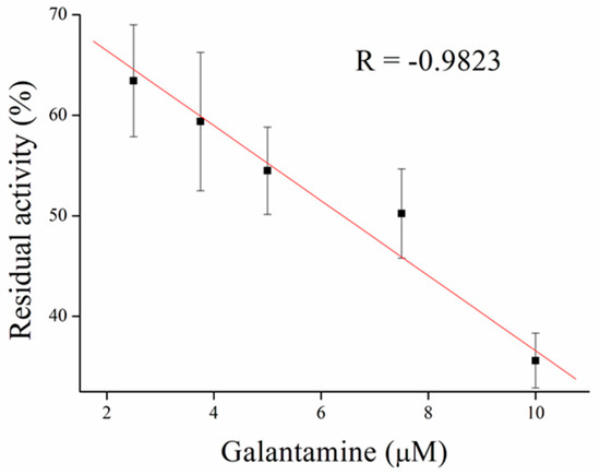 Galantamine can inhibit enzymes as a competitive inhibitor until it is eliminated from the active site. Therefore, we washed out galantamine from AChE to get original enzyme activity. For this purpose, we tested PBS pH 7.4 and AC pH 5.0. Phosphate buffer appeared to be inapplicable for galantamine elimination when we did not wash out galantamine from the active site, while AC proved to be efficient and the enzyme appeared to be active again. The probable mechanism is in changes of charge of amino acids in the active site of the enzyme in pH 5.0 and disintegration of interaction between AChE and galantamine (Figure 11).