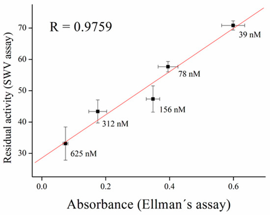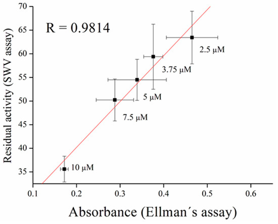 Inhibitors of AChE contain wide range of substances capable reduce its activity, especially drugs used in Alzheimer’s disease treatment or pesticides in agriculture can be mentioned as the broadly available [35]. As a model molecules for our measurement, galantamine was chosen as being representative of competitive inhibitor and carbofuran was chosen as the noncompetitive inhibitor. Carbofuran as a carbamate inhibitor needs time to bind to AChE. This time was investigated while five minutes was found to be sufficient for creating this bind. Concentration of substrate for these measurements was chosen to be 1 mM of ATChCl, due to economic reasons, when thiocholine peaks were still big enough for detection. We performed calibration curves in a concentration range from 2.5 to 10 µM of galantamine (Figure 5 and Figure 6) and from 39 to 625 nM of carbofuran (Figure 7 and Figure 8) and method was validated to standard Ellman’s assay (Figure 9 and Figure 10). There are no interferences in plasma as potential real sample towards thiocholine measurement. Potential after binding of carbofuran was found to be shifted in 565 ± 20 mV. SWV assay performed only with carbofuran did not reveal any peak in the record, thus this shift is caused by interaction of carbofuran with AChE. Analysis of inhibitors is nowadays performed mainly by chromatography techniques, however, determination of AChE is a usable tool. We calculated the limit of detection for galantamine to 1.5 µM and 20 nM for carbofuran. Nevertheless, there is a drawback of this method in a relatively narrow linear range for galantamine, resulting in poor detection limit against already published methods [36,37]. On the other hand it is well established that sensitivity is decreased once the enzyme is immobilized and it is also supported by recently-achieved results [5]. Carbofuran detection limit in ppb, using AChE as recognition tool, is considered to be a good result as was previously described in literature [38,39,40].