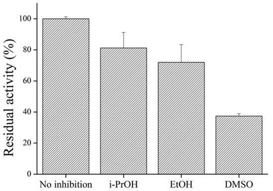 Organic solvents have to be considered as interference in every AChE measurement. Denaturation of enzyme molecules could have critical influence on analysis and thus it is important to keep percentage of solvents on minimum [5]. I-PrOH, EtOH, and DMSO were tested for their inhibition properties on AChE, all in 2.5% concentration. In the quoted work, DMSO was identified as a solvent capable to decrease AChE activity even in very small concentrations [45]. In tested concentrations, we found strong inhibition of AChE. Both alcohols appeared to be potent inhibitors of AChE as described earlier [46] (Figure 13).