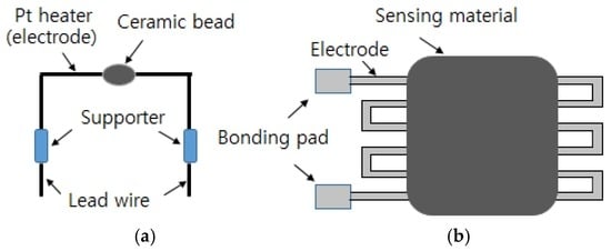 A one-electrode configuration that differs from the two-electrode type that has been previously used for semiconductor gas sensors has been developed. Korotcenkov [31] reviewed the design and type of the one-electrode configuration for semiconductor gas sensors. One electrode acts as both the heater and the measuring terminal, unlike the two electrode setup. As demonstrated in Figure 2, one-electrode gas sensors can be formed by applying the metal oxide in the form of a bead on the electrode material or by shunting the electrode through a coating [31]. Materials such as SnO2 [45,46,47,48], In2O3 [49], and Fe2O3 [50,51] are mainly used for one-electrode gas sensors.