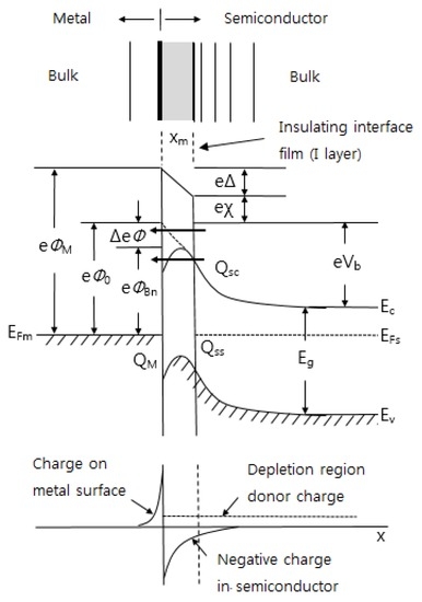 When a metal is contacted with a semiconductor, the contact area formation, energy band diagram, and charge distribution on the Schottky junction are shown in Figure 6. As mentioned above, when analyzing the bonding between metal and semiconductor, it is necessary to consider a thin insulating layer at the interface.This is because the insulating layer decouples the metal from the semiconductor so that each of them can be treated as a separate system. One can then regard the interface states as a property of the particular semiconductor-insulator combination and ignore any modification in the surface dipole contributions to the work functions of the metal and the semiconductor. These simplifications obviously are not possible in the case of clean contacts [108]. If there is no insulating film in the metal-semiconductor contact, the effect of lowering the barrier by the image force appears. This is called the image force lowering. If an electron is at a distance x from the metal surface, then there exists an electric field perpendicular to the metal surface. This is like the effect of a positive charge at a distance -x inside of a metal. It is seen from Figure 6 that the maximum in energy occurs at a distance xm from the metal surface and it can be shown that the magnitude ΔФ of the barrier lowering is given by [33]: