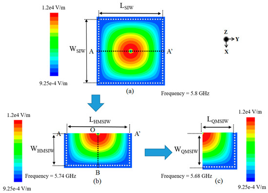 Figure 1 shows the simulated magnitude of the electric field distributions of the full SIW, half-mode SIW (HMSIW), and QMSIW resonators. When the SIW cavity resonator is cut on the AA’ plane along the magnetic wall, an HMSIW resonator can be realized [35,36]. Similarly, the QMSIW resonator can be realized by cutting on the OB plane of the HMSIW [37,38].