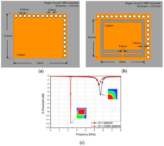 Geometry of (a) QMSIW and (b) CSRR-loaded QMSIW; (c) simulated S-parameters of CSRR-loaded QMSIW and QMSIW with the E-field distribution layout.