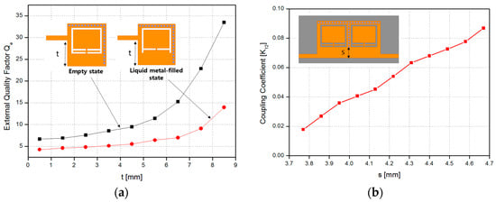 The external quality factor (Qe) can be controlled by the offset distance t from the feeding line, as shown in Figure 3a. The coupling coefficient K12 can be controlled by the offset distance s, as shown in Figure 3b. The coupling coefficient can be calculated using the following coupling coefficient method [39]: