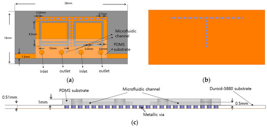 Figure 4 shows the layout of the proposed CSRR-loaded QMSIW band-pass filter, which is composed of two different substrates. The relative permittivity, thickness, and dielectric loss of the Duroid-5880 substrate are 2.2, 0.51 mm, and 0.0009, respectively. The PDMS substrate is attached on top of the Duroid-5880 substrate to form the microfluidic channels. The relative permittivity, thickness, and dielectric loss of PDMS are 2.8, 1 mm, and 0.02, respectively.
