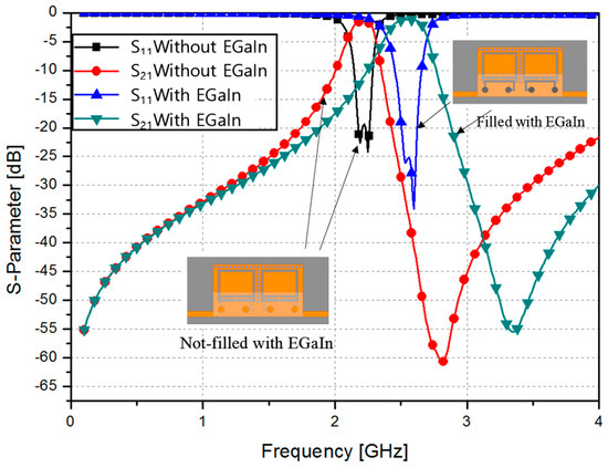 Simulated S-parameter of the CSRR-loaded QMSIW before and after injecting EGaIn.