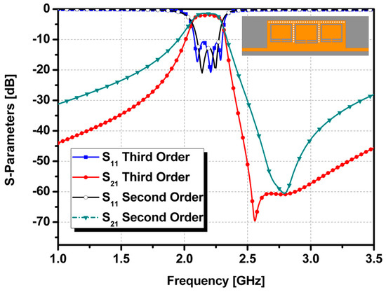 In Figure 6, the S-parameter results of second-order and third-order CSRR-loaded QMSIW band-pass filters are compared. Thus, the proposed filter design can be extended to higher orders by using the demonstrated approach. The equivalent circuits for the proposed second-order and demonstrated third-order bandpass filter designs are shown in Figure 7.