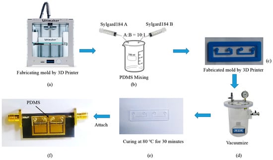 Fabrication process of the microfluidic channel: (a) Fabricating the mold using a 3D printer; (b) mixing of the PDMS solution; (c) pouring of the PDMS solution into the mold/frame; (d) vacuuming; (e) curing; and (f) Final sample (PDMS attached to the Duroid substrate).