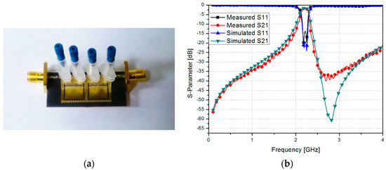 Figure 10a shows the measured S-parameter results before and after the microfluidic channels were filled with liquid metal. The liquid metal was injected using a micropipette. After the injection, the center frequency shifted from 2.205 GHz to 2.56 GHz. An insertion loss of less than 1.5 dB with an in-band and a return loss greater than 15 dB were achieved. The fractional bandwidth changed from 6.8% to 9.38%.