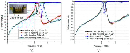 Measured S-parameter of the fabricated CSRR-loaded QMSIW (a) before and after injecting the microfluidic channels with EGaIn; and (b) before injecting EGaIn and after the removal of EGaIn.