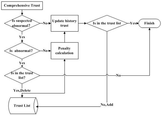 If the comprehensive trust is higher than the suspected threshold, then the anomaly threshold is compared. If it is lower than the anomaly threshold, then the penalty operation is performed to update the historical trust.