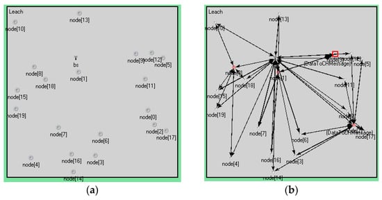 In the experiment, the number of nodes was 20. The sink node was set to 1. The cluster head nodes—which are calculated by the sink node—were set to 3. Each experiment had 3 rounds, and each round of the cluster head node was to be selected again. The nodes were randomly distributed in a square area. The detailed values are shown in Table 1. Figure 4 is a graph of node distribution and a topological graph with 20 nodes. Cluster heads and nodes within a cluster in each round are shown in Table 3. Figure 4 and Table 3 show that the cluster heads and topologies of each round were not exactly the same.