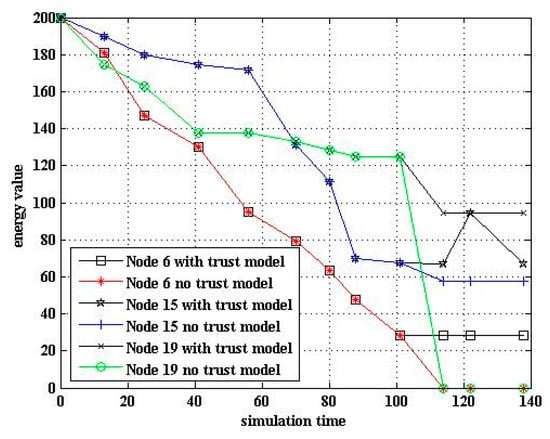 In WSNs, the main energy consumption comes from communication. In the experiment, the connection between the node and the cluster head was managed through the trust value. When the trust value of the sensor nodes was less than the abnormal threshold, the cluster heads were disconnected, reducing the energy consumption. As can be seen from Figure 6, the algorithm with the trust model had fewer dead nodes than that without it. Therefore, the trust model could improve the survival rate of the nodes. Figure 7 shows the trend of the energy of cluster heads 6, 15, and 19 in two cases of algorithms with and without the trust model. Other nodes had small differences in energy consumption.