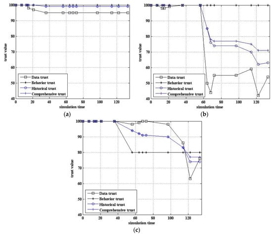 Comparison of trust value in different state. (a) Normal node; (b) Node with abnormal data; (c) Node with suspected data and behavior.
