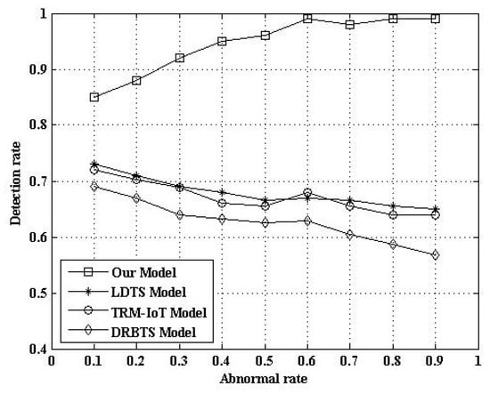 In order to evaluate the effect of the detection of abnormal nodes, we compared our model with a lightweight and dependable trust system (LDTS) model from the literature [], the trust management model based on fuzzy reputation for IoT (TRM-IoT), and the distributed reputation-based beacon trust system (DRBTS). The LDTS employs a clustering algorithm and constructs a lightweight trust evaluation scheme and a dependability-enhanced trust evaluation approach. It can adaptively adjust the weights for cluster heads’ (CHs) trust aggregation. This approach can effectively reduce networking consumption while preventing malicious, selfish, and faulty CHs. However, this method only considers data forwarding and communication behavior. It does not consider the role of sensor data. Therefore, the detection ability of abnormal nodes can be further improved. The TRM-IoT is also a trust and reputation model based on behavior. Its advantage is the use of fuzzy theory []. The simulation result is shown in Figure 10. Figure 10 indicates that the detection rate of our model is higher than that of the LDTS model. The reason is that our model includes three factors: data, behavior, and historical inertia. The LDTS model only deals with behavioral factors.